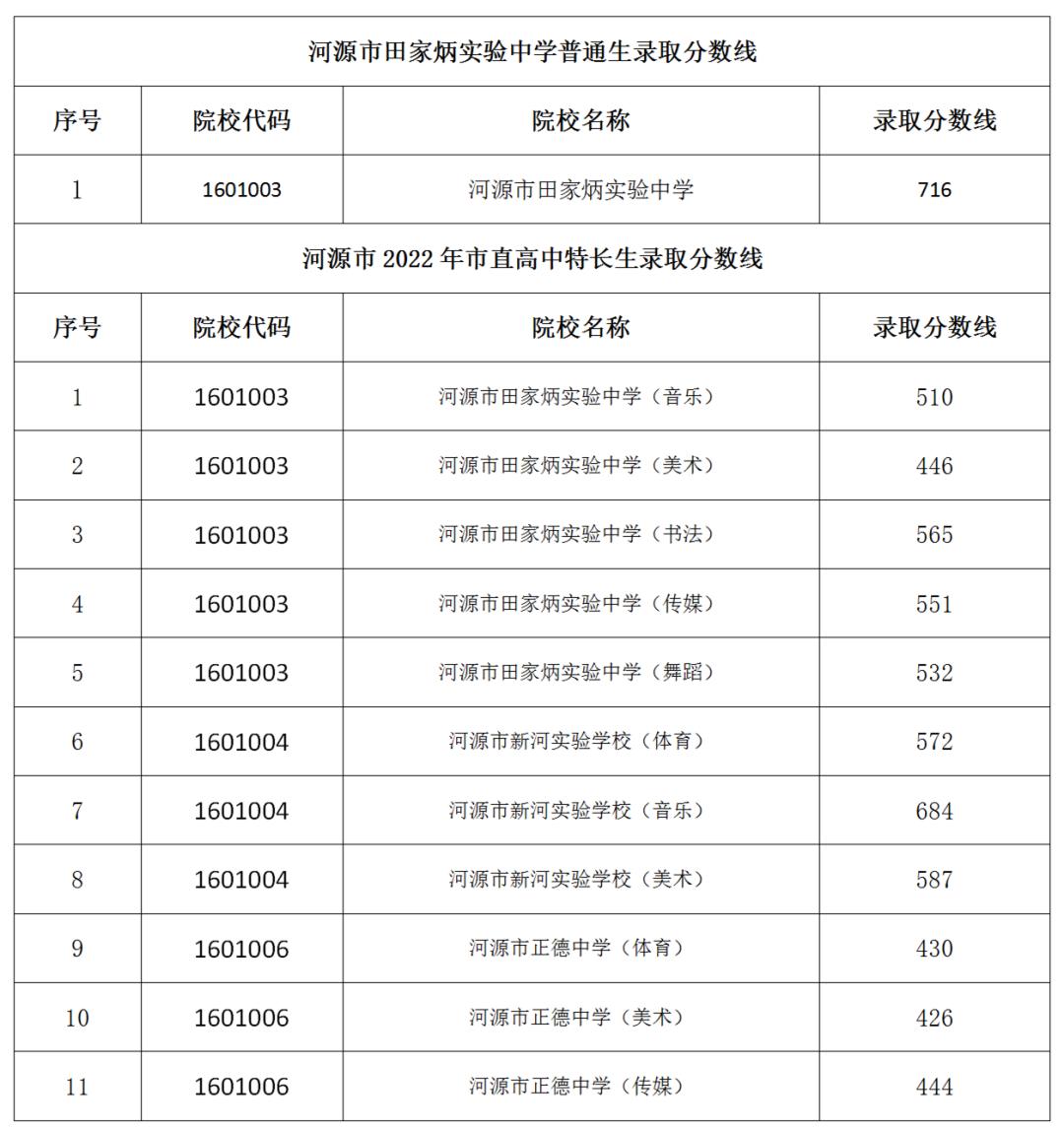 <河源市2022年高中阶段学校招生录取工作方案>的通知》(河教〔2022〕21号)精神,依据各学校招生计划及考生志愿,按照“分数优先,遵循志愿”的原则,经投档,现将河源市田家炳实验中学普通生、特长生和市直民办高中特长生录取结果公布如下:河源市2022年高中阶段学校招生录取工作方案>一、录取分数线