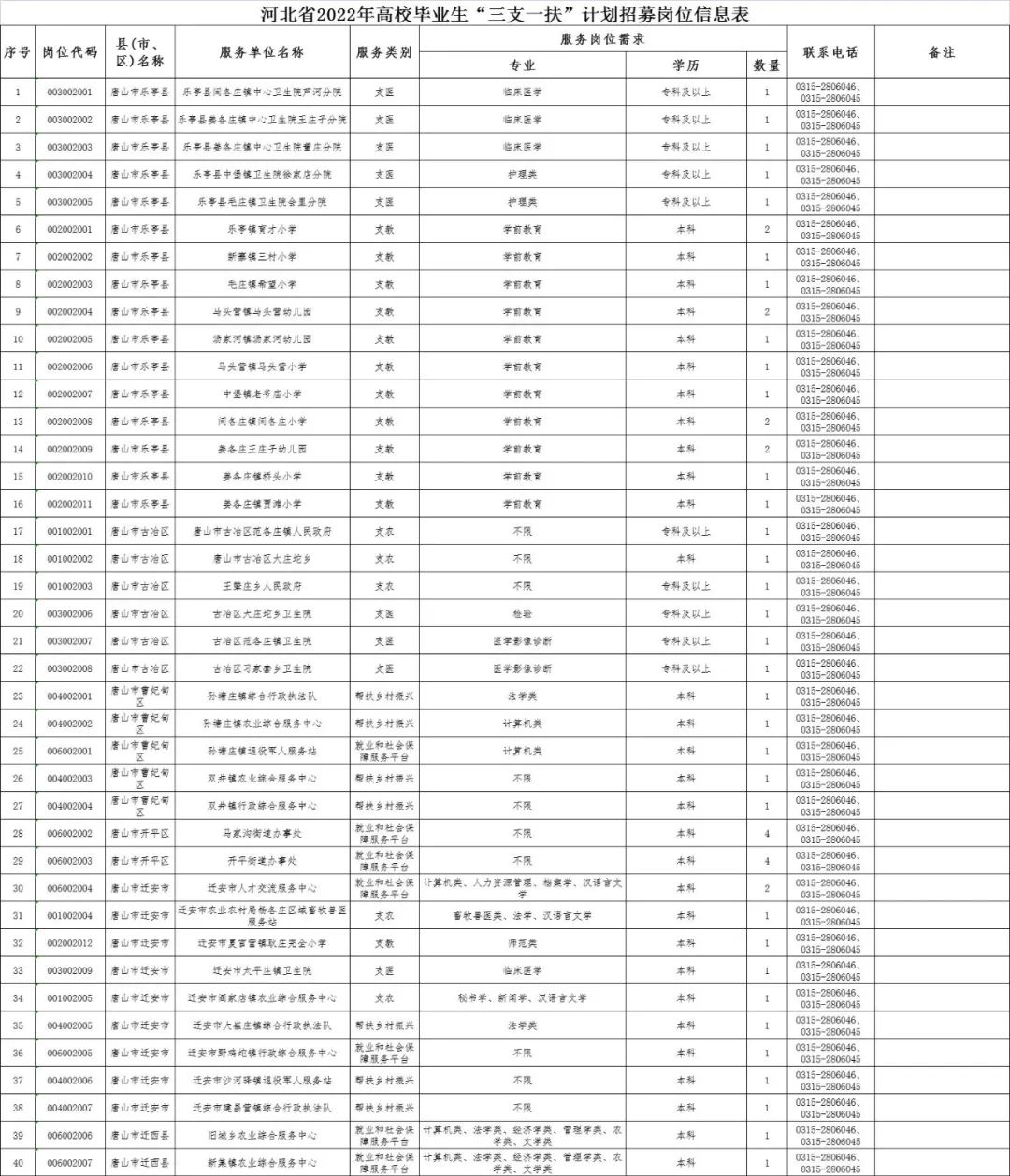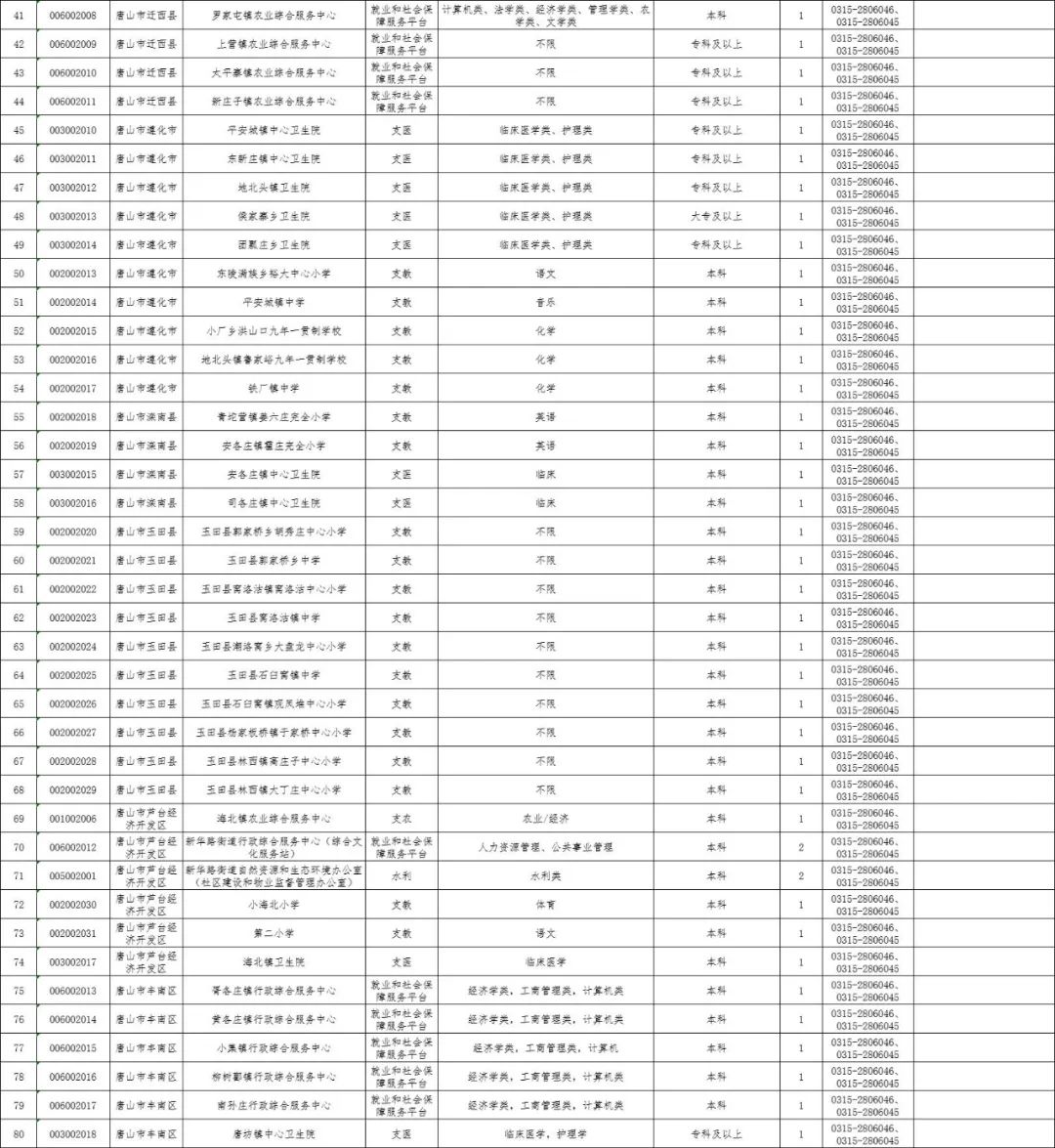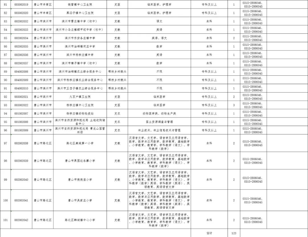 2022年计划招募“三支一扶”志愿者1300名。各地招聘人数、具体岗位、条件、咨询电话详见《河北省2022年高校毕业生“三支一扶”计划招募岗位信息表》(附件,以下简称《岗位信息表》)。《岗位信息表》通过河北人社网(rst.hebei.gov.cn)、河北人才网(www.hbrc.com.cn)、河北人事考试网(www.hebpta.com.cn) 查询。其中唐山招募123名志愿者,岗位信息表如下: