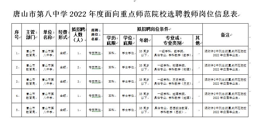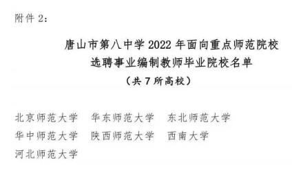 2、唐山市第八中学面向重点师范院校选聘事业编制教师8名。