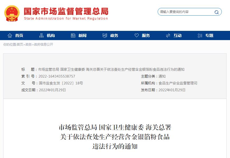 今年,市场监管总局、国家卫生健康委、海关总署联合印发《关于依法查处生产经营含金银箔粉食品违法行为的通知》(国市监食生发〔2022〕18号),要求严厉打击生产经营含金银箔粉食品、虚假宣传金银箔粉可食用、进口含金银箔粉食品等违法违规行为。