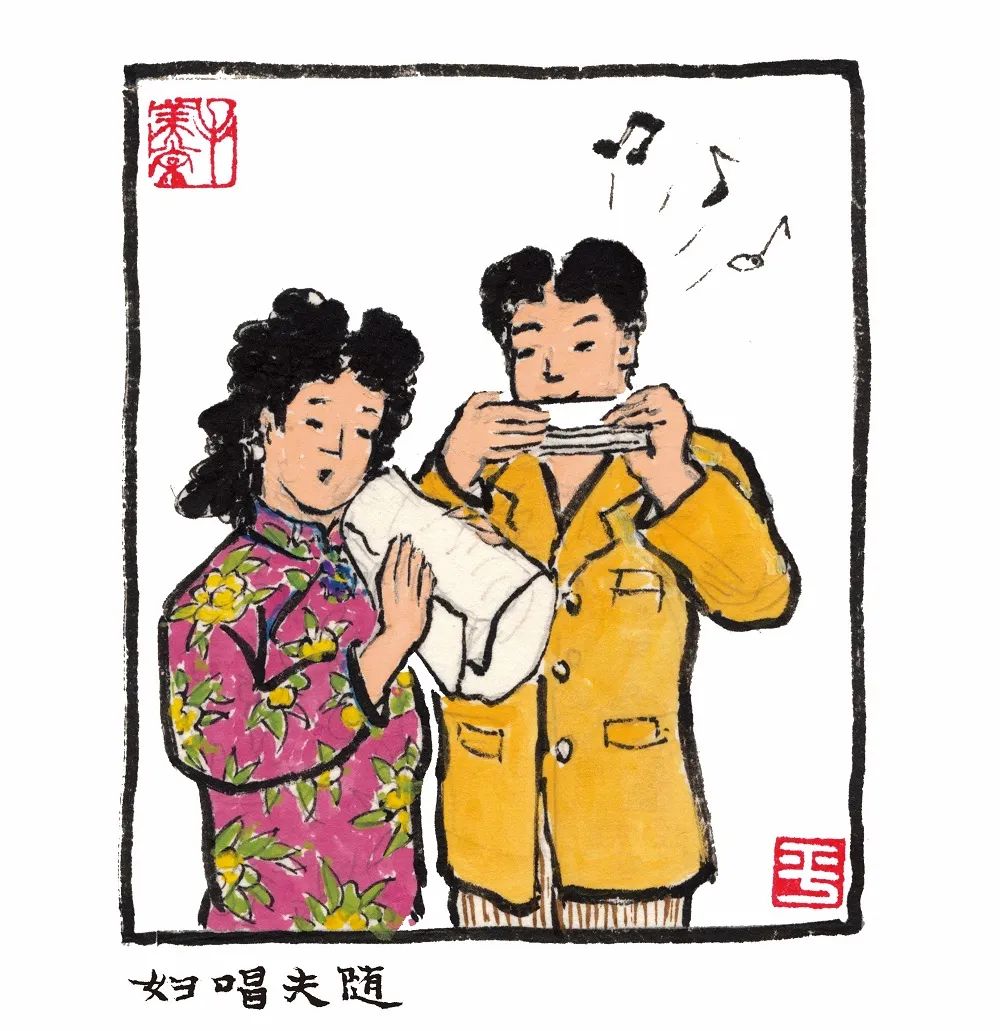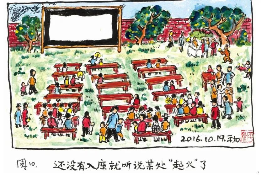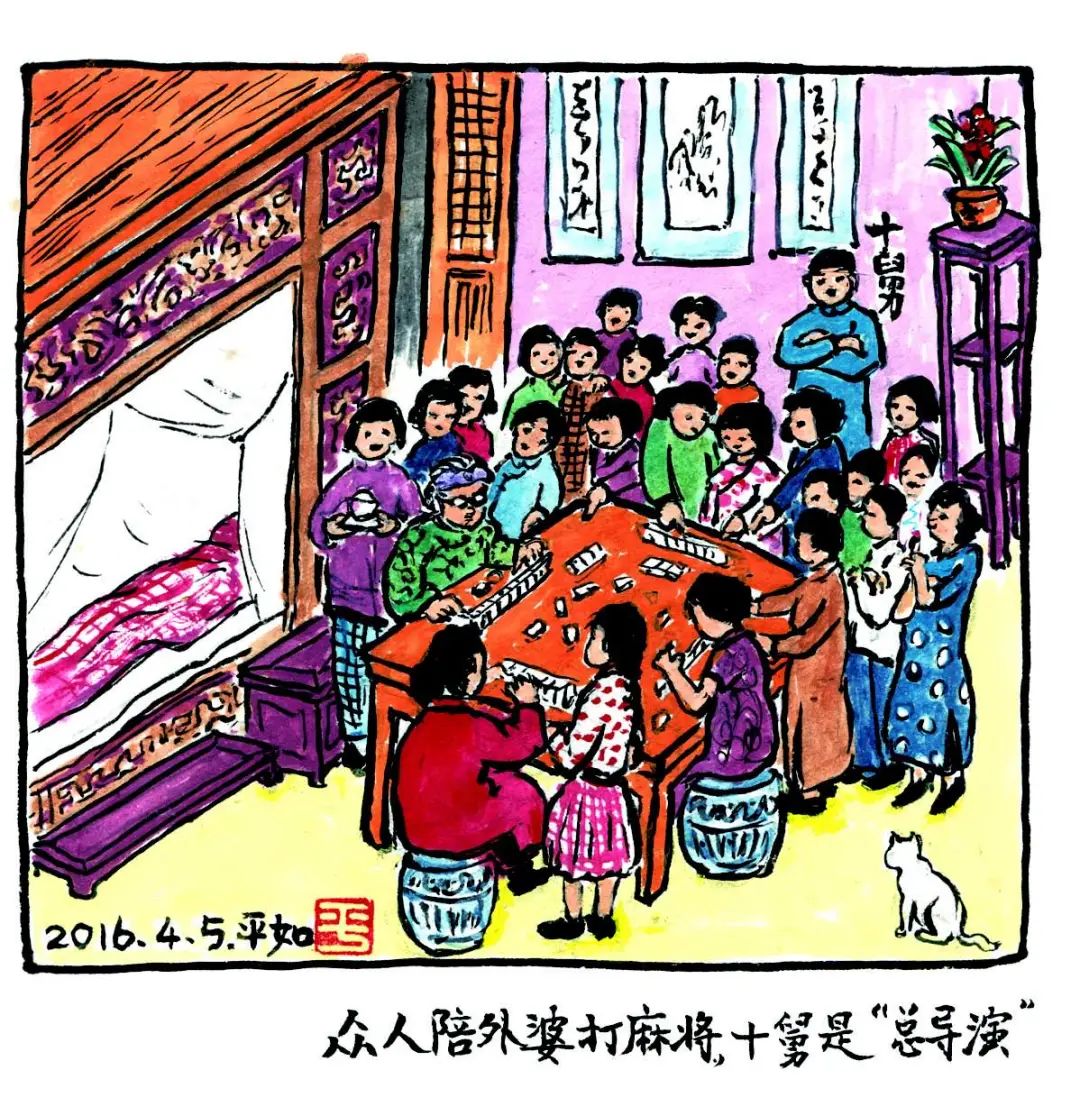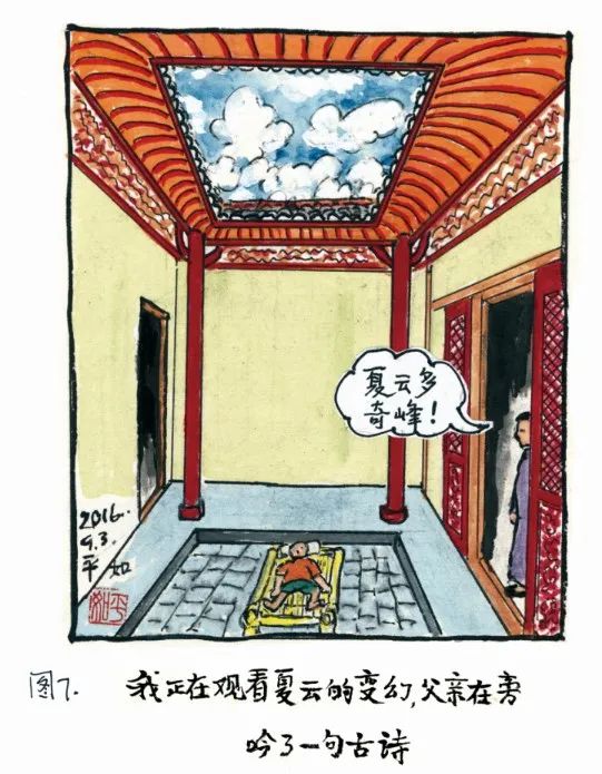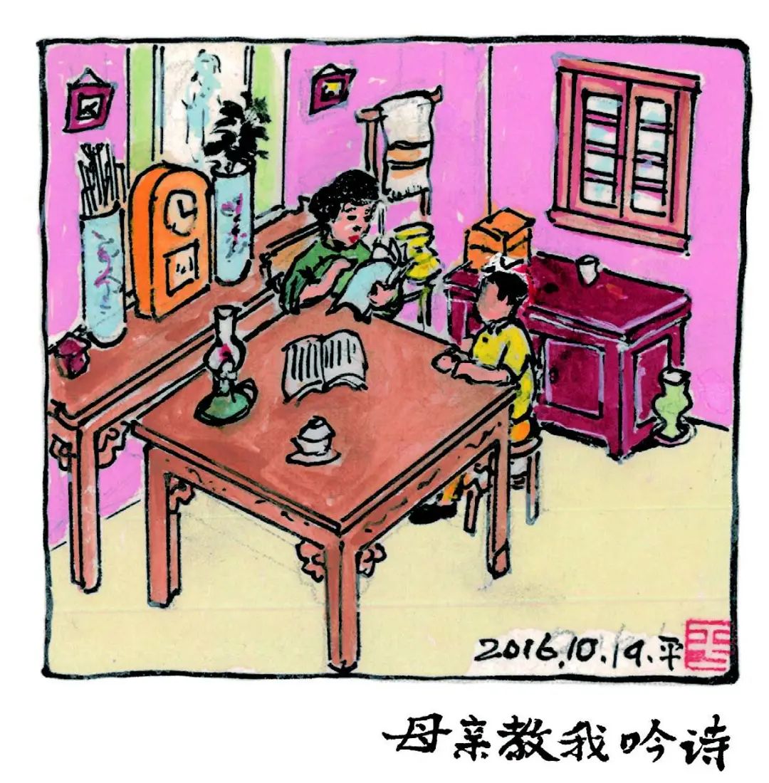 有些是他的回忆。比如忆起童年母亲教他吟诗,他就附上一张自己和母亲一块读诗的绘画。比如想起去外婆家参加热闹的家宴,就附上一张“外婆家席散后之送客回家图”。