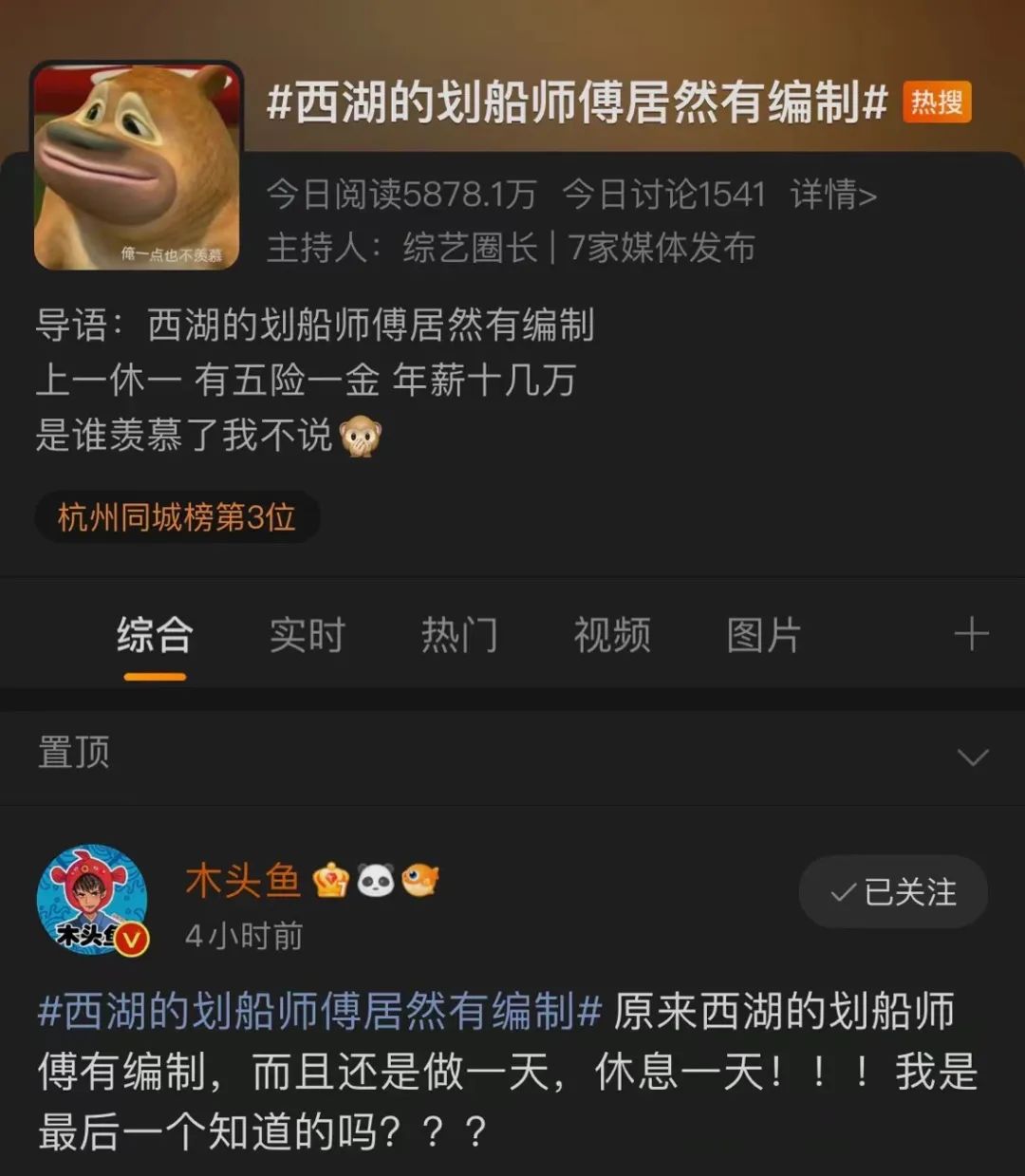 7月28日,一则关于“西湖的划船师傅居然有编制”的消息冲上了杭州同城热搜。