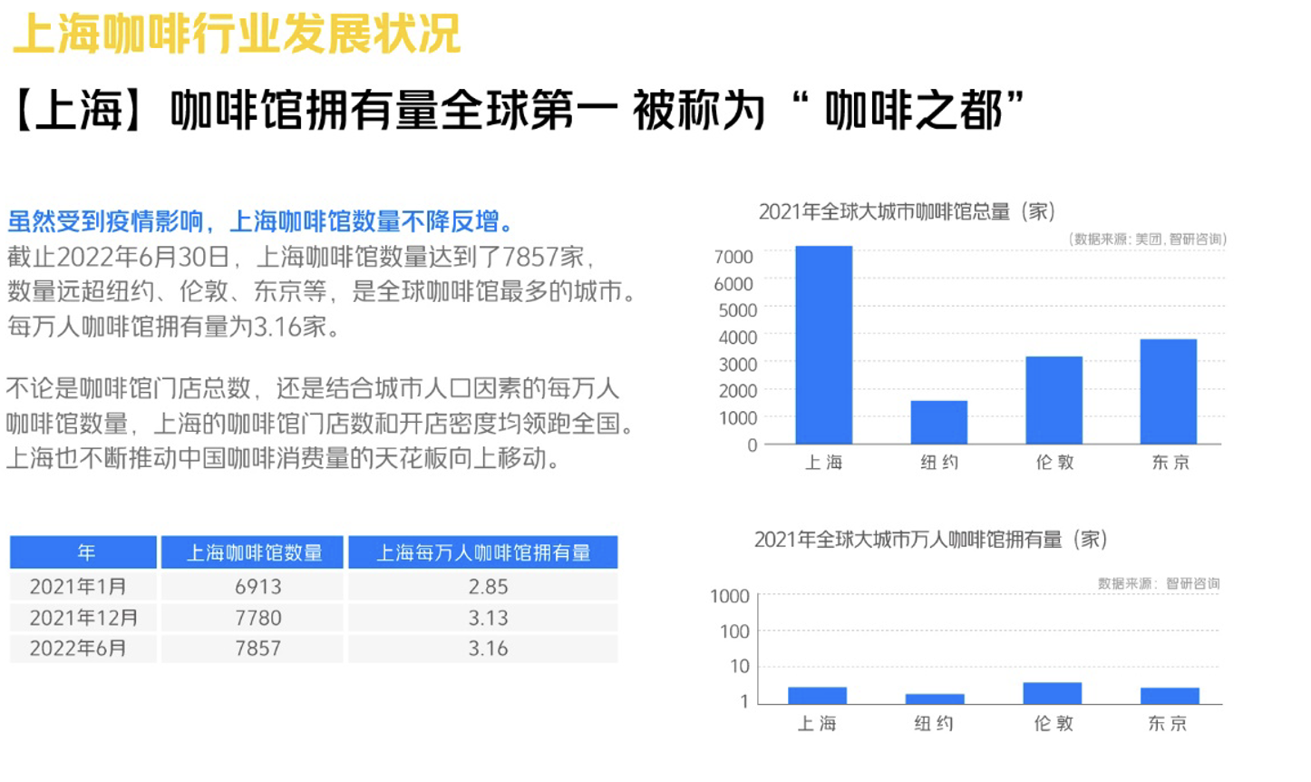 据美团在发布会上公布的《中国咖啡消费洞察》,2022年上半年,中国内地共有咖啡门店11.73万家,市场发展潜力巨大,全国咖啡门店数量最多的城市前三位分别是上海、北京、广州。其中,上海的表现格外抢眼,虽受疫情影响,本地咖啡馆数量不降反增。