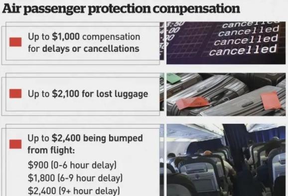 加拿大:抵达目的地超过0-6小时,赔偿900加币;6-9小时,1800加币;超过9小时,2400加币。