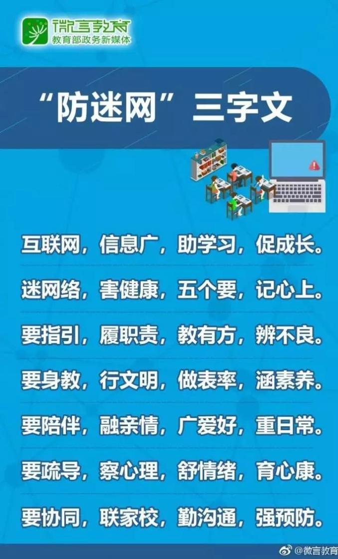 今年4月,教育部发出《致全国中小学生家长的一封信》,引导家长积极、快速行动起来,有效预防中小学生沉迷网络。信中还有“防迷网”三字文,朗朗上口,便于记忆。一起学习↓↓↓