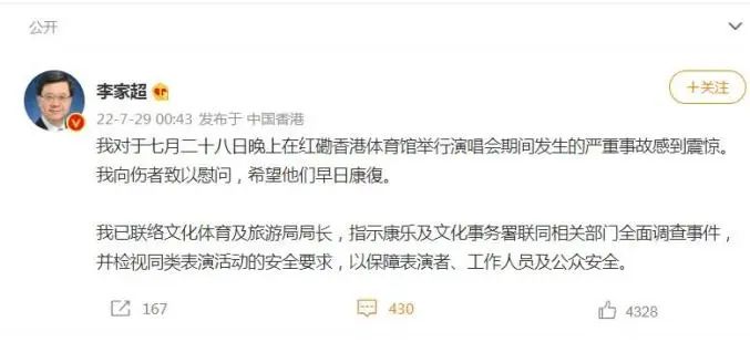 香港特区行政长官李家超7月29日凌晨发表声明表示,对于7月28日晚上在红磡香港体育馆举行演唱会期间发生的严重事故感到震惊,并向伤者致以慰问,希望他们早日康复。