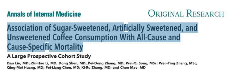 [3]]Liu D,Li ZH,Shen D,Zhang PD,Song WQ,Zhang WT,Huang QM,Chen PL,Zhang XR,Mao C.Association of Sugar-Sweetened,Artificially Sweetened,and Unsweetened Coffee Consumption With All-Cause and Cause-Specific Mortality:A Large Prospective Cohort Study.Ann Intern Med.2022 May 31.doi:10.7326/M21-2977.Epub ahead of print.PMID:35635846.