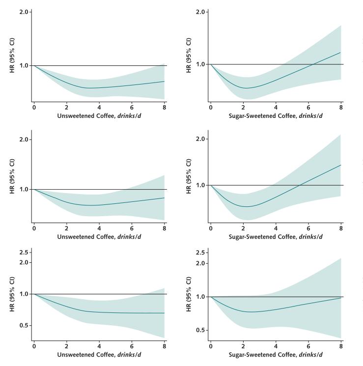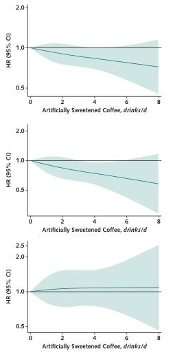 图5 人工甜味剂咖啡摄入量与全因(顶部)、癌症(中部)和心血管疾病(底部)的剂量-反应相关性