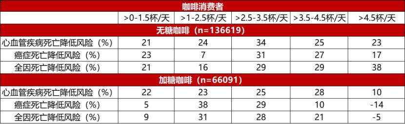 从以上列出的研究数据看,每天喝2.5-3.5杯不加糖咖啡以及3.5-4.5杯加糖咖啡预防心血管疾病死亡死亡效果可能是最好的。