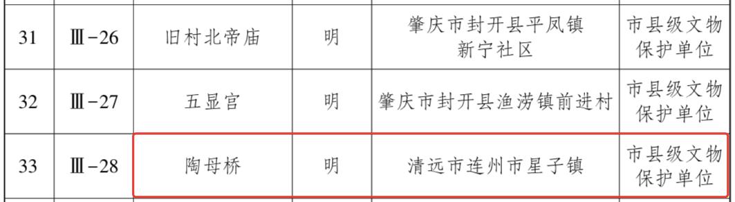 7月28日,广东省人民政府官方网站公布第十批广东省文物保护单位名单。清远4处不可移动文物被列入名单。其中,广东省立文理学院连县办学旧址、连州陶母桥、连山杨愈将故居入选为第十批广东省文物保护单位。连州丰阳村古建筑群(并入丰阳古道)入选为“与现有广东省文物保护单位合并的不可移动文物”。