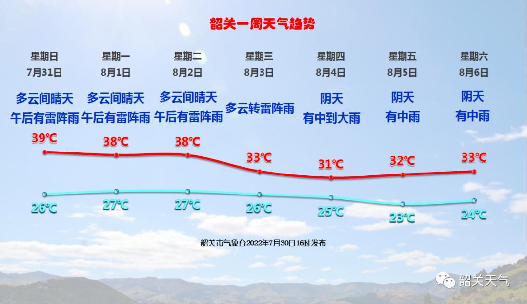 7月9日至30日,广东已连续多天出现大范围持续性的高温天气过程。昨晚我市虽有阵雨,但据@韶关天气 消息,预计未来一周前中期我市仍维持高温炎热天气,最高气温37℃到39℃,午后偶有阵雨。气象部门提醒:高温时段尽量减少出行、户外作业,做好防暑防晒措施;天气燥热,居家需注意用火用电安全;正值暑假,外出游玩时,注意人身安全,不在无安全防护的江河湖泊、工地水塘等区域游泳、玩耍;遇雷雨及时躲避。