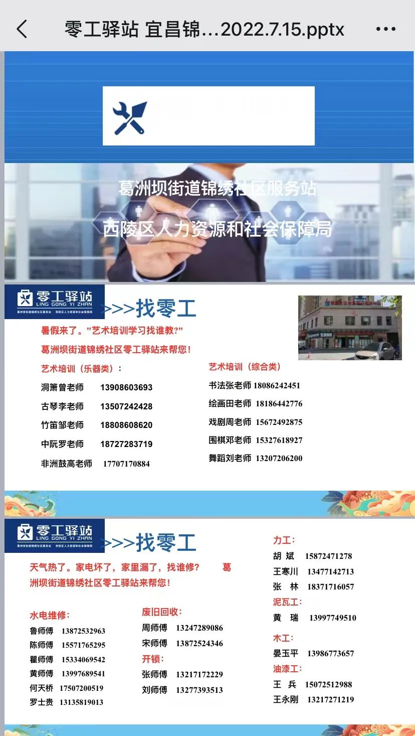 线上零工驿站考虑到目前找零工的居民大多为集中在40到60岁之间的中年人,对于目前市面上的各类求职APP、网站操作并不熟练,线上“零工驿站”其实是依托于各小区居民微信群发布的PPT文档,12个社区均采用统一模板,并定期与每月15日和30日发布,居民只需要点开文档,所有信息一目了然,有问题也可直接在群内咨询社区工作者。