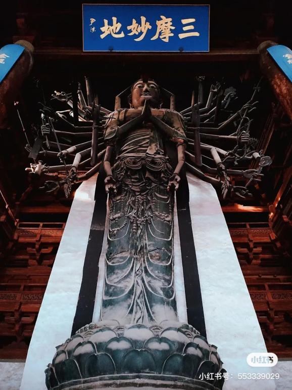 隆兴寺大悲阁内供奉的铜铸千手千眼观世音菩萨立像,通高21.3米,铸造于北宋开宝四年(971年),铜像身躯高大,比例适度,其形体之巨、雕工之细实为罕见,是世界上古代铜铸佛像中最高大、最古老的千手千眼观世音菩萨像。