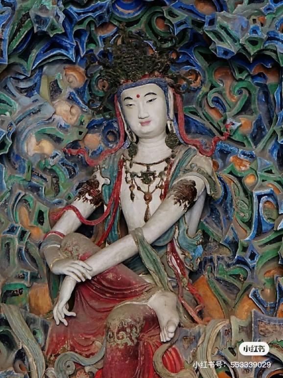 隆兴寺摩尼殿内,玲珑典雅的宋代泥塑五彩悬山上,一尊自在观世音菩萨塑像端庄恬静地坐在五彩悬山之中。观音像左足踏莲,右腿踞起,两手抱膝,身体稍向前倾斜,面容恬静,柳眉之下,那双智慧深邃的眼睛微微俯视,恰与礼佛者仰视时形成感情上的交流。其人格化的仪表,突破了宗教偶像的呆板样式,为形神兼备的古代女子形象。当年,鲁迅先生辗转得到这尊观音的照片,并非常欣赏这一艺术佳作,视为珍宝,摆于书案,至今仍在北京鲁迅故居陈列。