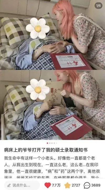 她被保送了研究生,把录取通知书带到病床上的爷爷面前,打算给他一个惊喜。并且把这温情的一刻记录下来,发了小某书。