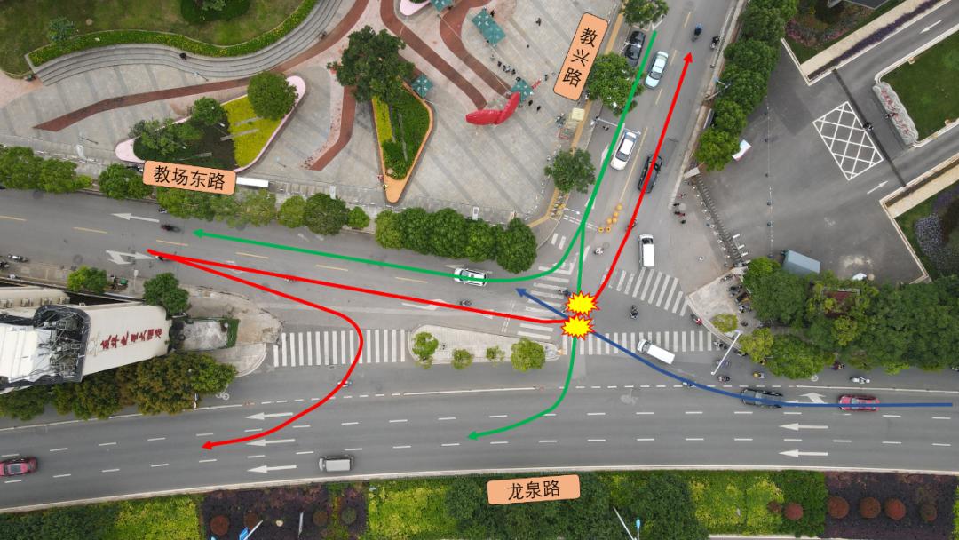 教场东路禁止左转进入教兴路,规范行车秩序,减少冲突点。
