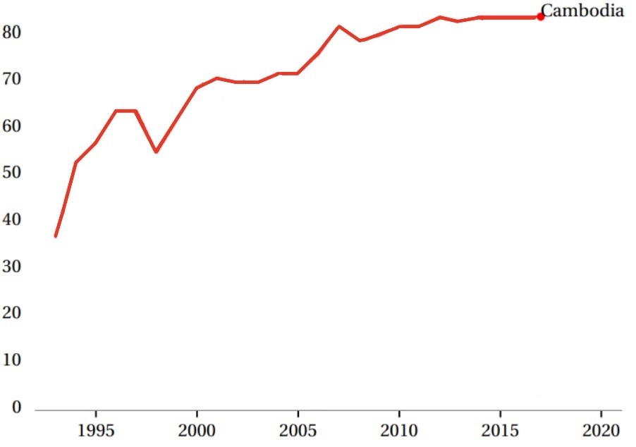 图1 1993-2020年柬埔寨美元化(FCD/M2)变化情况