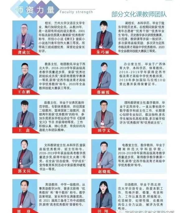 学校现有教师106人,其中文化课教师72人,本科学历70人、专科学历2人,持高级中学教师资格证70人,学历达标率96%;音乐、美术等专业课教师34人,学历达标率100%,建立了一支“高水平、乐奉献、富激情”的优秀教师团队。现有教学班18个,在校学生1003人(高三5个班269人、高二5个班280人、高一8个班454人)。学校有6大办学特色:名师助力、精准提升——强校合作、培养特长——设施完善、课堂高效——低进高出、直击高考——活动育人、德育为先——封闭管理、培德树人。2017年,学校花巨资购买王后雄教育资源用于培训教师,从根本上提升了教研水平;与兰炼一中结对帮扶,定期开展教学交流活动,引进“兰炼一中常志焕名班主任”工作室研训基地,开展班主任培训;与北京慧世界集团、甘肃广业美术培训中心、兰州贝多芬音乐学校、北斗星传媒的通力合作,实现了艺术特长生培养的资源共享,教育教学质量全面提升!2017年参加高考96人,有45人被本科院校录取;2018年参加高考112人,有58人被本科院校录取;2019年参加高考166人,有66人被本科院校录取;2020年参加高考187人,有97人被本科院校录取;2021年参加高考226人,有105人被本科院校录取,高考二本上线人数逐年增加。2021年高考上线人数荣登定西市民办学校榜首!2022年参加高考人数为285人,上线人数达115人,一本上线69人,二本上线46人,突破百人大关。近年来,学校毕业生高考录取率达98%左右,受到当地政府、教育行政部门和群众的一致好评!