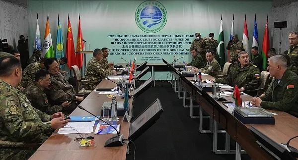 当地时间2021年9月23日,俄罗斯奥伦堡州,“和平使命2021”上合组织联合反恐军演持续进行,各国军队官员出席总参谋长会议。图/人民视觉据上合组织地区反恐中心的数据,仅2013年至2017年,上合组织成员国有关机构共制止了600多起具有恐怖主义性质的犯罪活动,摧毁500多个武装分子培训基地,抓获2000多名国际恐怖组织成员,缴获1000多件自制爆炸装置、50多吨爆炸物、1万多支枪支及100多万发子弹。