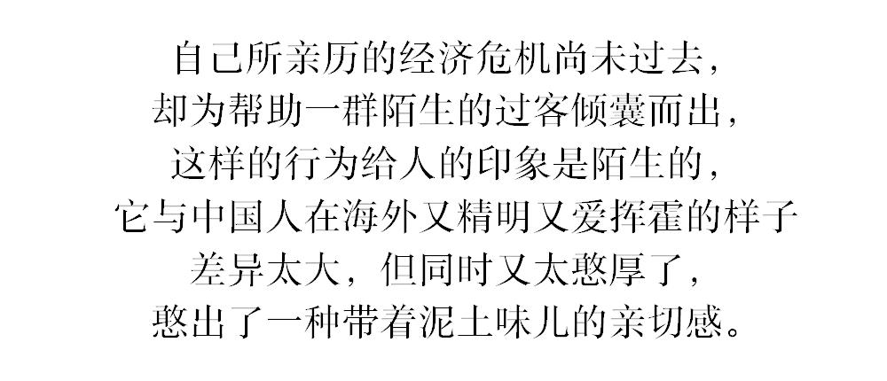 “都谁参与了,谁捐了多少物资,我这都没有记录了,很遗憾。”自己所亲历的经济危机尚未过去,却为帮助一群陌生的过客倾囊而出,这样的行为给人的印象是陌生的,它与中国人在海外又精明又爱挥霍的样子差异太大,但同时又太憨厚了,憨出了一种带着泥土味儿的亲切感。