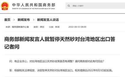 商务部新闻发言人就暂停天然砂对台湾地区出口答记者问:有企业关心,对台湾地区出口天然砂政策是否有调整?请问商务部对此有何回应?商务部新闻发言人表示,根据相关法律规定,决定暂停天然砂对台湾地区出口。相关措施自2022年8月3日起实施。