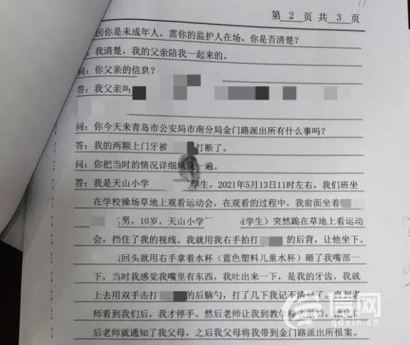 2021年5月,青岛市天山小学4年级学生张某在学校运动会上,被同班同学李某用水杯打断两颗门牙,起因是李某跪坐在草地上挡住张某视线,张某提醒其坐下时发生争执,经鉴定牙齿损伤为轻伤二级。张某家长为此将打人者李某、李某家长、天山小学告上法庭。今年5月,青岛市市南区人民法院判决李某家长赔付医药费及精神损害抚慰金。不过,张某家长却告诉信网(0532-80889431),“天山小学教师在法庭上给了不实的情况说明。”那么,这又是怎么回事呢?