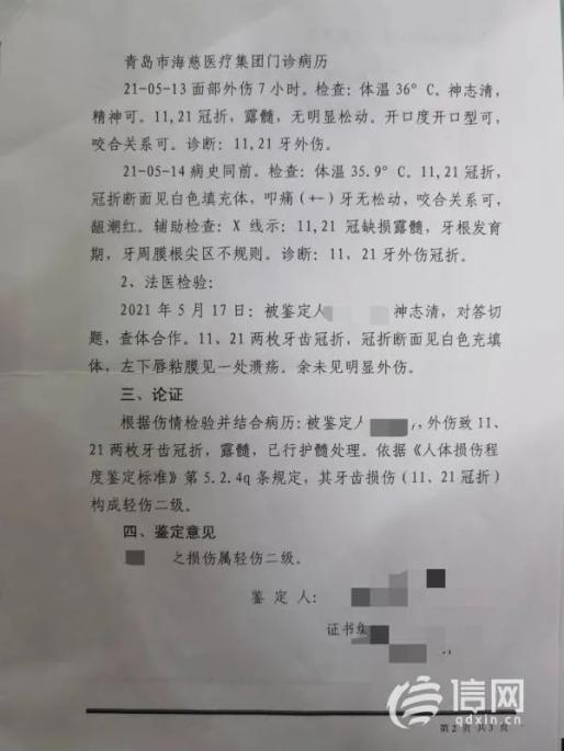 信网了解到,根据青岛市公安局市南分局刑事侦查大队刑事科学技术室出具的法医学人体损伤程度鉴定书,张某的牙齿损伤构成轻伤二级。“这意味着孩子牙齿的断裂部分,不可逆不可再生,只能通过后期修补。以后太冷太热太硬的食物孩子都吃不了,牙齿的损伤是永久性的。”因伤情严重,张某家长多次带着孩子奔走医院治疗,而据张某家长称,在事情发生后的第三天,打人者家长未再联系其处理后续医疗费赔偿事宜,也并未道歉。学校方面的态度,也并不积极。