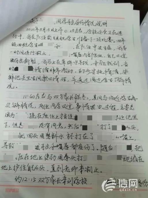 虽然医药费有了着落,但对于当时法院审理中,孩子班主任出具的一份手写情况说明,让张某家长至今耿耿于怀。“班主任向法院提交的情况说明中,称是我家孩子先打人,还说对方家长事发后多次找我沟通,是我不协商。不知道学校老师写这样不实的证言是什么想法?”张某家长认为,孩子被打伤,学校没有负起相应的责任,反而让老师做虚假证言,希望学校能给出一个合理的解释。