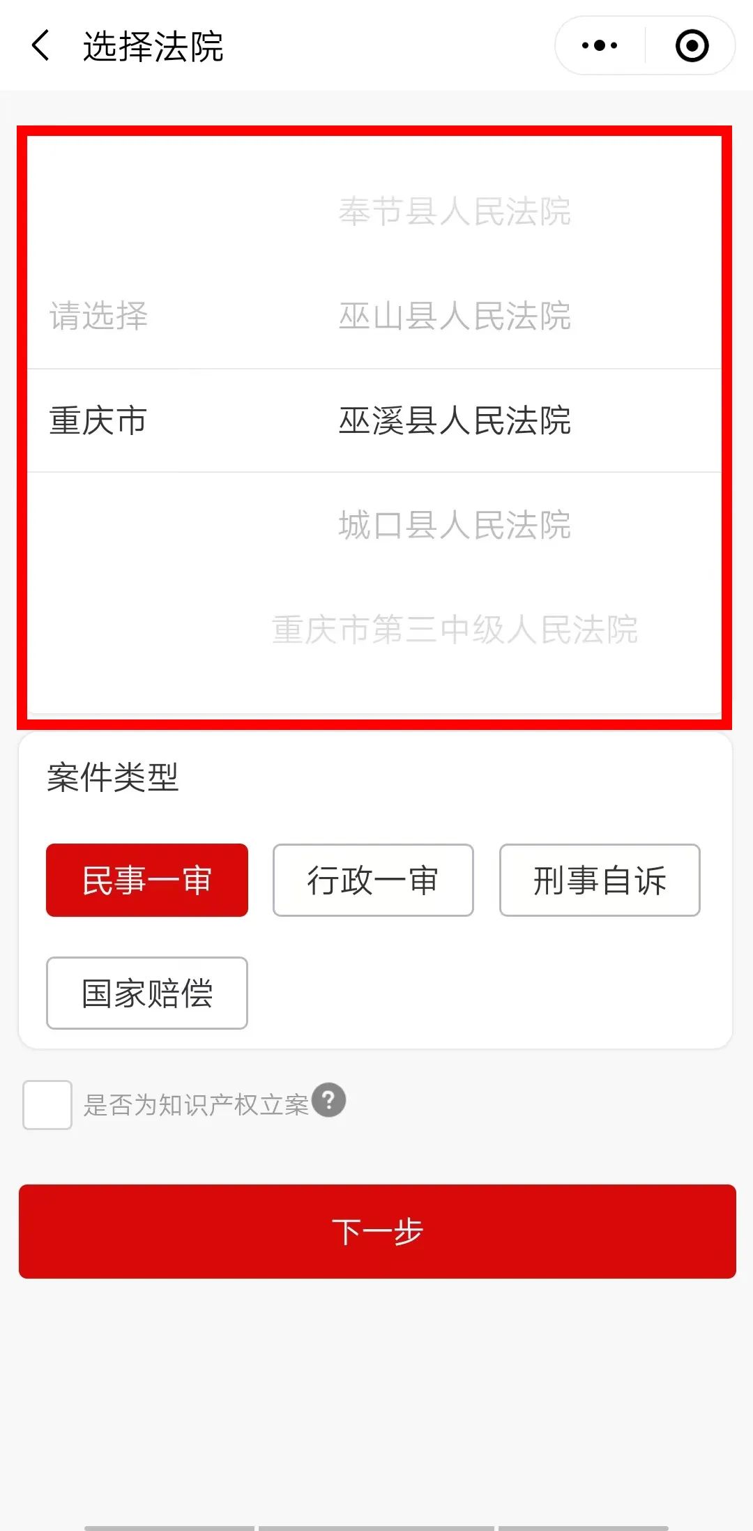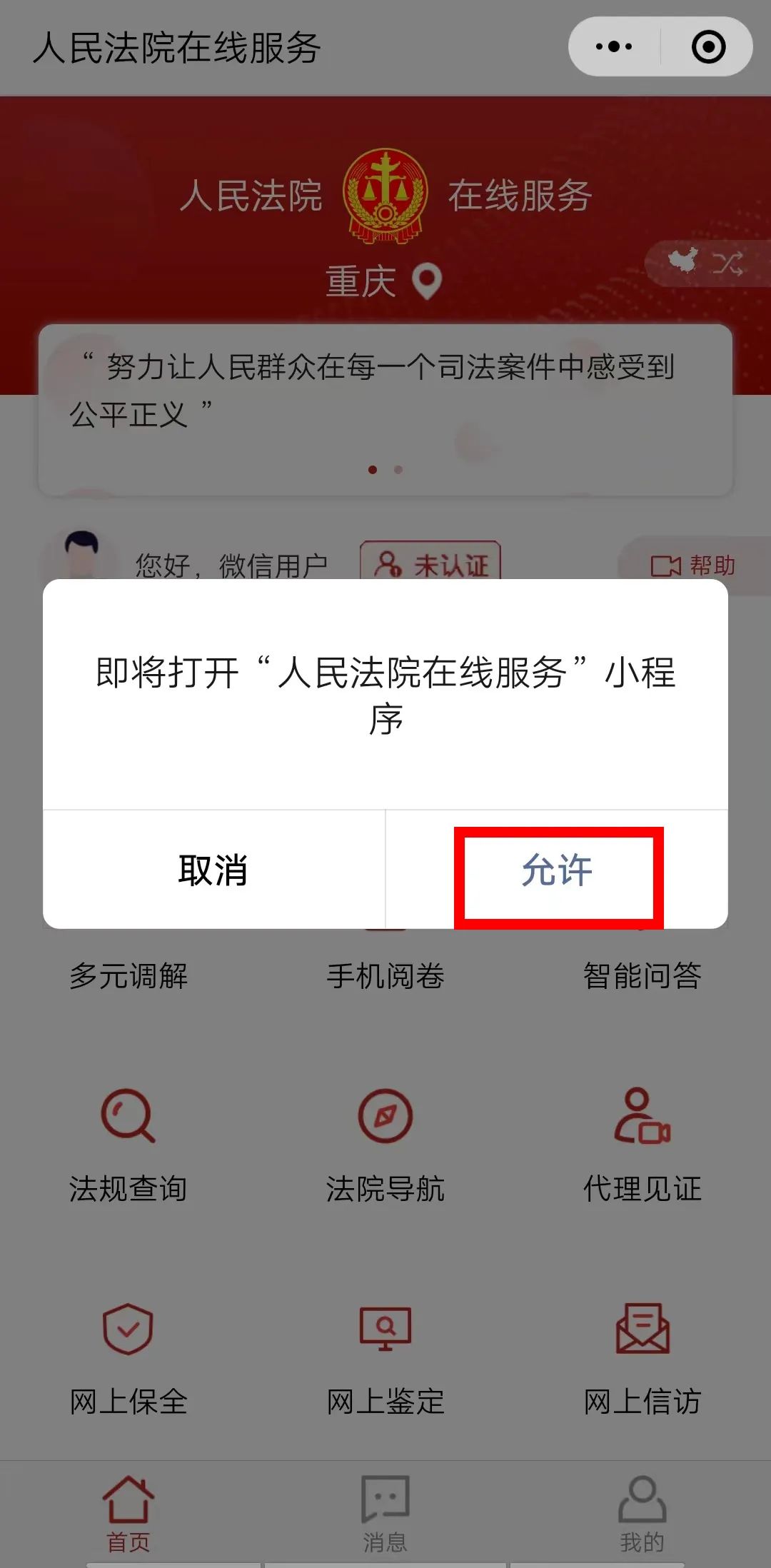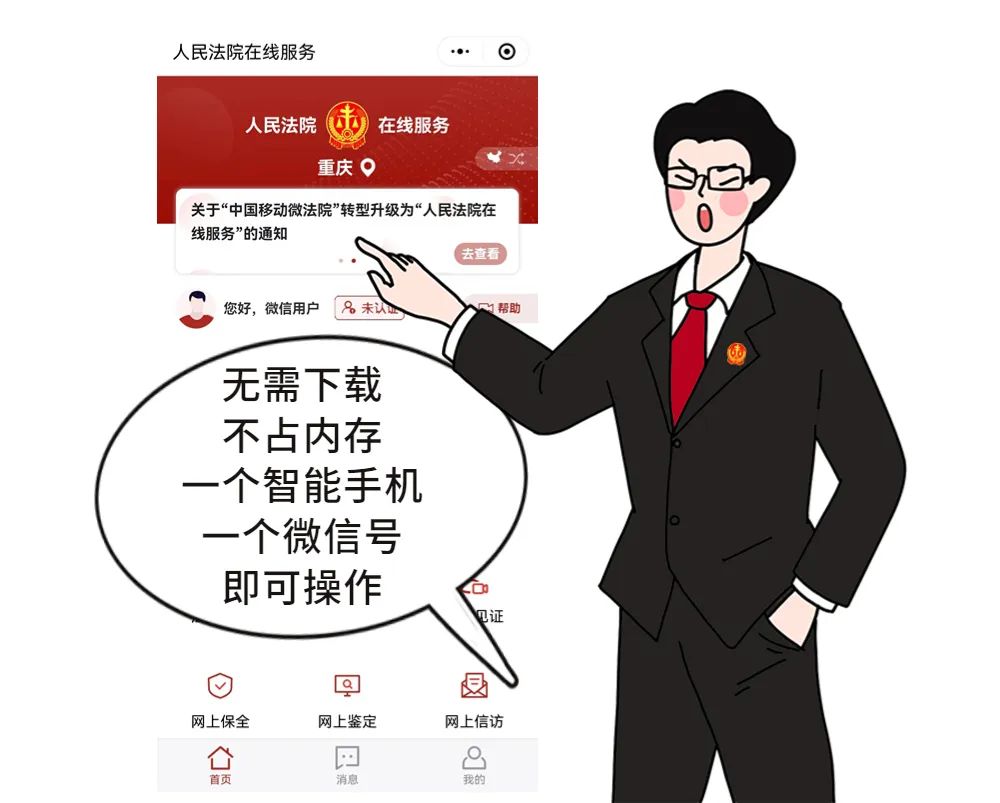 在微信小程序中搜索“人民法院在线服务”或“人民法院在线服务重庆”(具体可按您想要立案法院所在的省、自治区、直辖市名称进行搜索),即可进入人民法院在线服务平台。