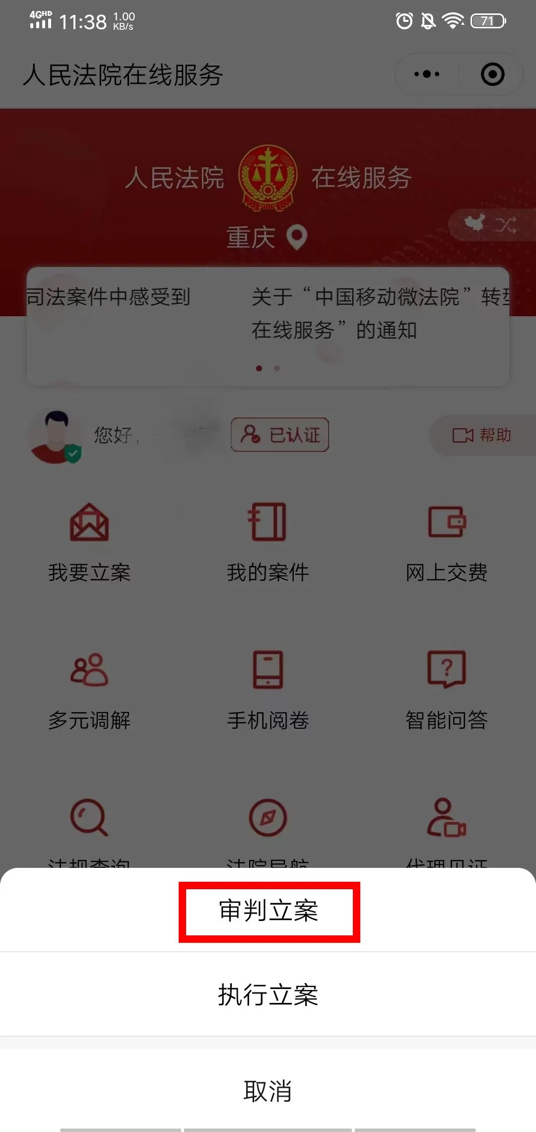 首页点击“我要立案”,界面会出现“审判立案”和“执行立案”两个选项以及“取消”选项。点击“审判立案”可进行民事、行政立案,点击“执行立案”可进行强制执行立案,点击“取消”则返回首页。