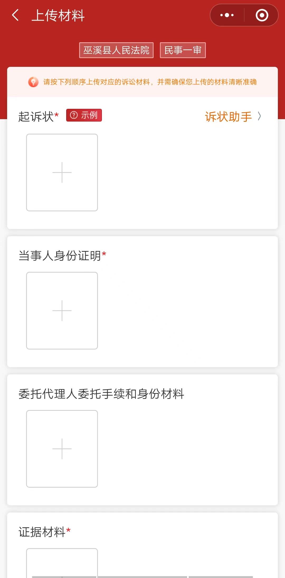 •第四步提交立案材料网上立案提交的材料可以是图片或者PDF格式。若材料较少,可通过拍照上传,需拍摄平整清晰,背景不杂乱。如材料较多,强烈建议先扫描成PDF文件后上传(打*的为必传项)。