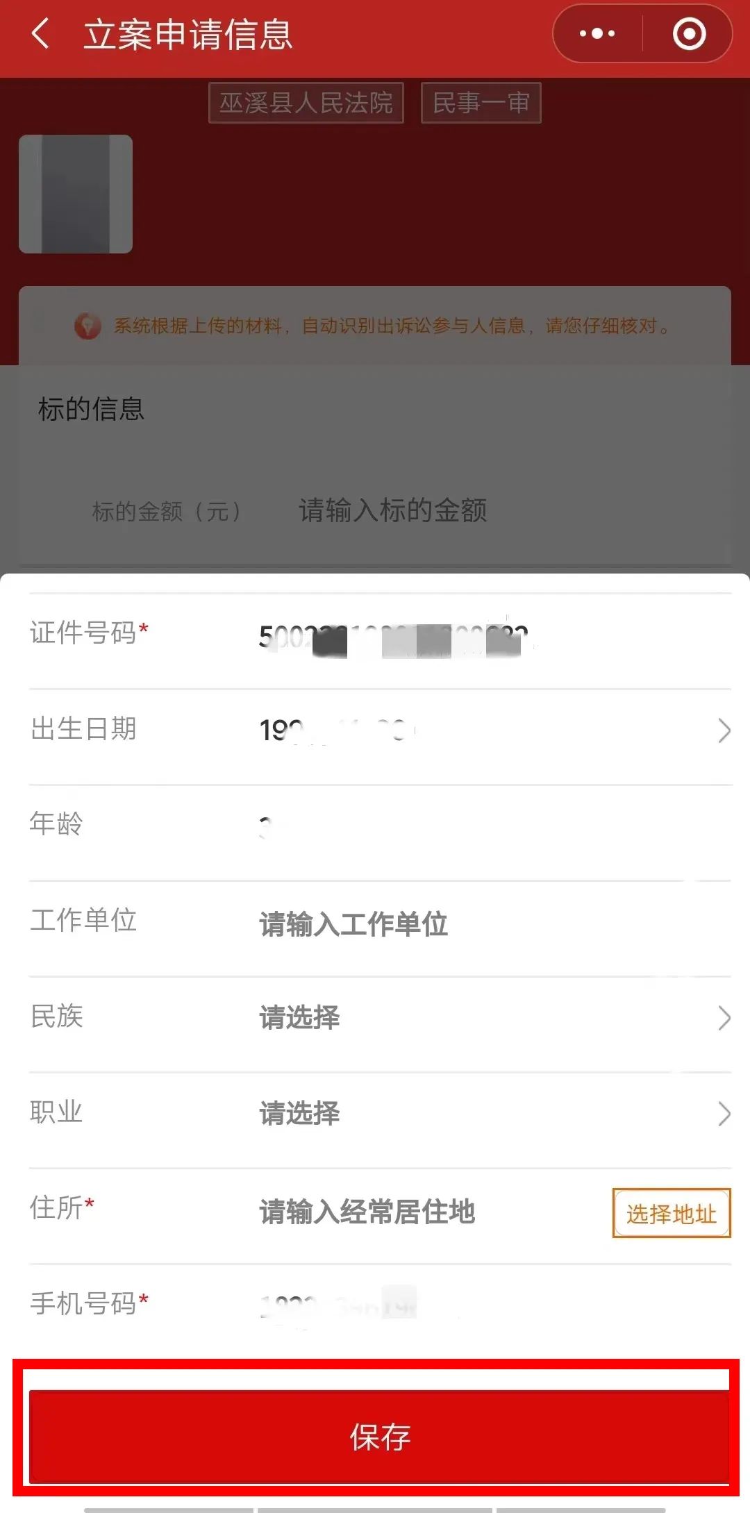 •第五步核验诉讼参与人信息上传诉状、证据、当事人基本信息等材料后,系统将自动识别诉讼参与人的信息,请您务必仔细核对,点击"待补全",增补或更正有关信息后,点击保存并提交。