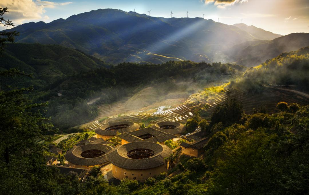 独一无二的田螺坑土楼群,在不同的角度观看也呈现出不同的景观。从上观景台往下俯瞰,土楼群就像一朵盛开的梅花,点缀在群山之间,从下观景台看,几座楼群错落有致,酷似神圣的“布达拉宫”(游览时间约60分钟)。