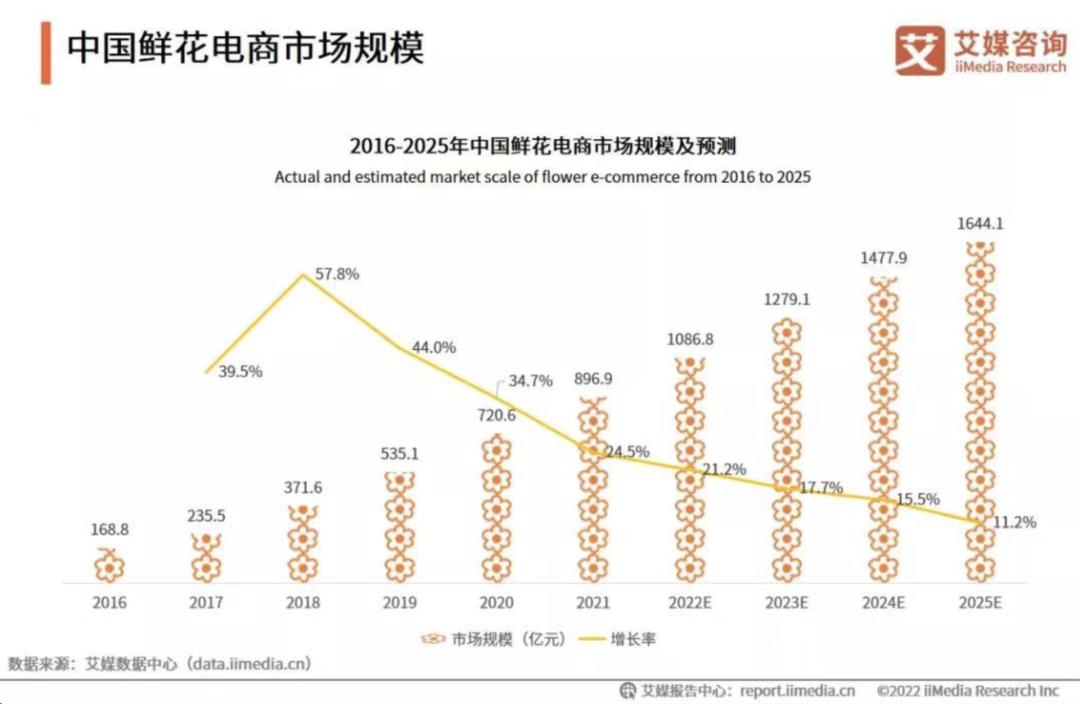 根据艾媒咨询《2022-2023年中国鲜花电商市场发展研究报告》,中国鲜花电商市场规模在2021年已经达到896.9亿元人民币,并预计在2022年达到1086.8亿元。