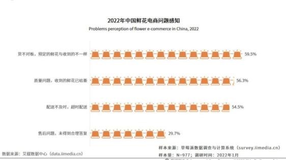 如林杰所说,艾媒咨询的调查问卷显示,“配送不及时”“收到鲜花不够新鲜”分别占比客户对鲜花电商问题感知度的54.5%和56.3%。