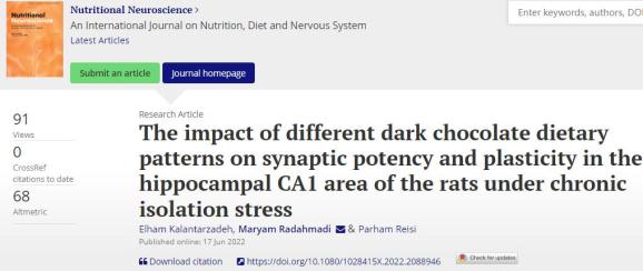 [1]Elham Kalantarzadeh, Maryam Radahmadi & Parham Reisi (2022) The impact of different dark chocolate dietary patterns on synaptic potency and plasticity in the hippocampal CA1 area of the rats under chronic isolation stress, Nutritional Neuroscience, DOI: 10.1080/1028415X.2022.2088946