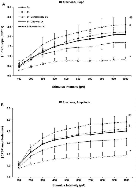 结果显示,Co组和St组这两组间的I/O曲线的fEPSP斜率和振幅表现出显著差异(p<0.05),提示压力降低了脑内海马CA1区顶端树突层的神经反应性和突触效力。而与St组相比,强制黑巧组的fEPSP斜率和幅度显著增强,而限制黑巧组略有增强,这表明强制和限制性用黑巧喂养小鼠,均能有效提高应激条件下的突触效力。类似的变化趋势也出现在LTP的测量中。