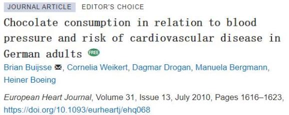 [2]Buijsse B, Weikert C, Drogan D, Bergmann M, Boeing H. Chocolate consumption in relation to blood pressure and risk of cardiovascular disease in German adults. Eur Heart J. 2010;31(13):1616-1623. doi:10.1093/eurheartj/ehq068