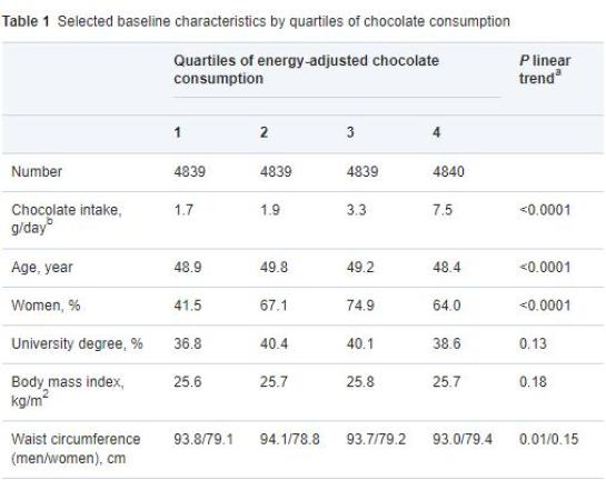 经过总能量调整后的巧克力摄入量显示,最高四分位组的平均巧克力摄入量为7.5g/天,比最低组高出6g。
