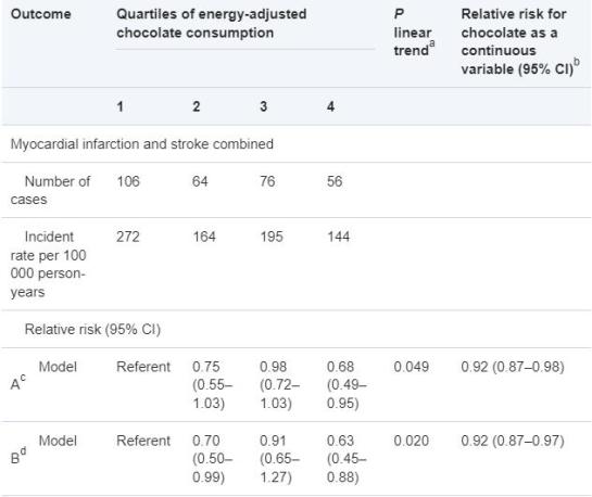 此外,转变为连续变量后,参与者的巧克力摄入量与心血管疾病风险呈反比。与最低四分位组相比,最高组的罹患中风风险降低46-48%,而心肌梗塞和中风的合并风险降低32-39%。