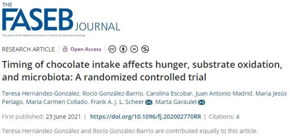 [3]Hernández-González T, González-Barrio R, Escobar C, Madrid JA, Periago MJ, Collado MC, Scheer FAJL, Garaulet M. Timing of chocolate intake affects hunger, substrate oxidation, and microbiota: A randomized controlled trial. FASEB J. 2021 Jul;35(7):e21649. doi: 10.1096/fj.2020770RR. PMID: 34164846.