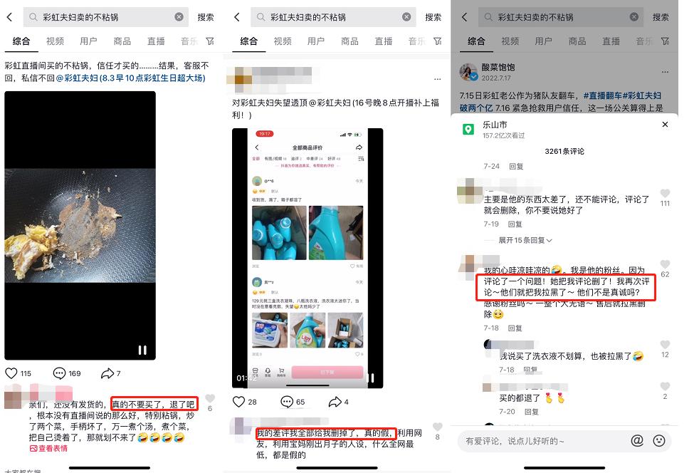 消费者对彩虹夫妇直播产品的一些负面评论最关键的问题在于,在他们因为自爆盈利上热搜的同一天,#彩虹夫妇卖的不粘锅#同样在抖音成为热议话题。不少消费者发布视频提及在彩虹夫妇直播间购买的产品质量差、售后态度差,发布差评被删被拉黑。说到底,产品质量才是根本,以“真实”为标签的彩虹夫妇正在遭遇最严峻的挑战。