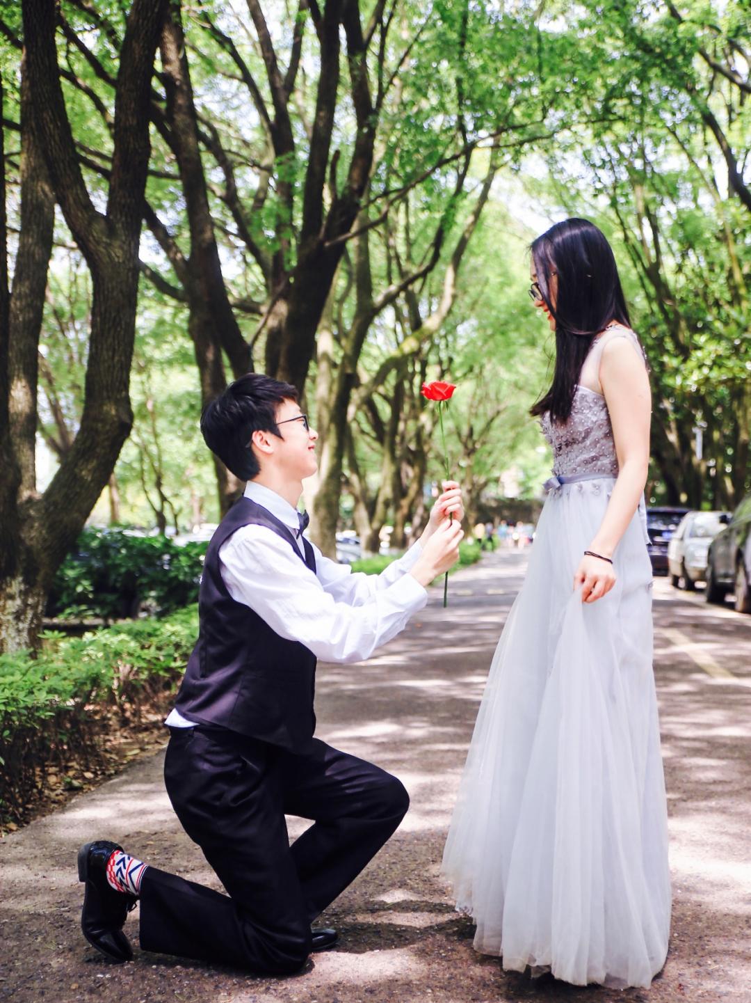 我们各自在深圳奋斗着,每到周末我们就相互约出来见面。这些年有过吵闹,耍过脾气,但最后我们都因深爱对方而学会包容。2017年是我们恋爱的第五年,我们回到了南昌,想回母校看看,回忆我们的青春。那天晚上他在母校学弟学妹的见证下向我求婚,在新民广场的灯光中,学弟学妹们的手里闪光灯和欢呼声下,我觉得这辈子就是他了吧。