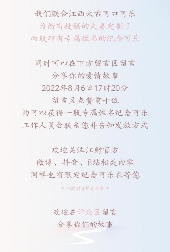 2022年,是我们相恋的第十一年,这十一年间,我们从同学,到情侣,再到夫妻,如今为人父母,经历了很多,很高兴彼此牵起的手从没有松开过。未来,我也将继续用我的余生去守护她们,做一个好丈夫、好爸爸。有机会,我们一定会带“可乐”回一趟母校,带他看看爸爸妈妈曾经生活学习过的江财校园。感谢江财,让我们能在人生最美好的年纪相遇。也在七夕之际,祝天下有情人终成眷属。