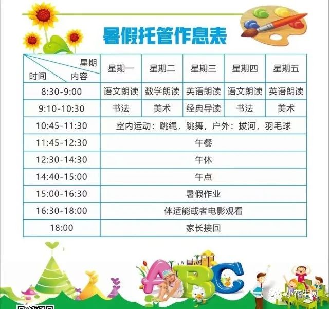 我觉得这个方案比学校附近的暑托班好,学校附近的暑托班一般是早读写字自习之类的,看计划安排表自习的时间并不多。