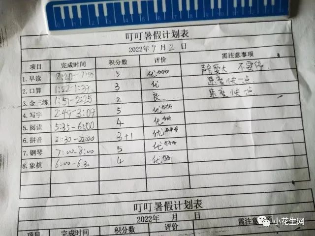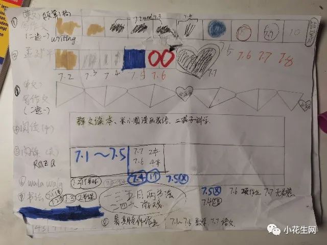 孩子涂得有点儿乱,每天的任务是我安排的,但是他可以提意见,后来他觉得我的安排中,每天一篇中文作文一篇英文作文太重了,要求中文英文二选一,我就答应了。如果计划的制定孩子不认可,那孩子不会心甘情愿执行的。