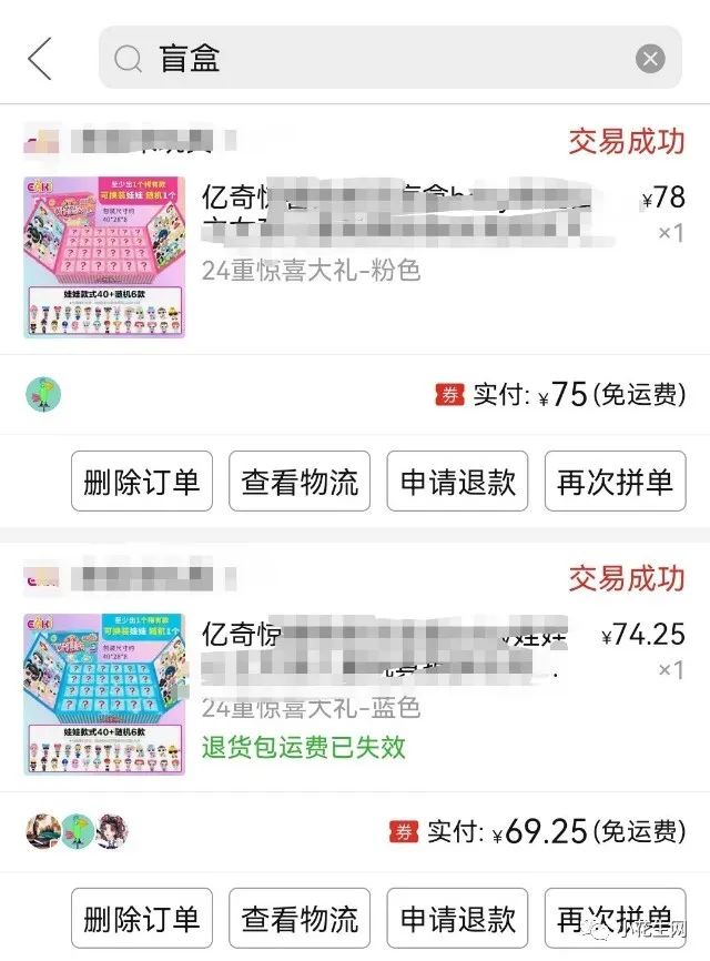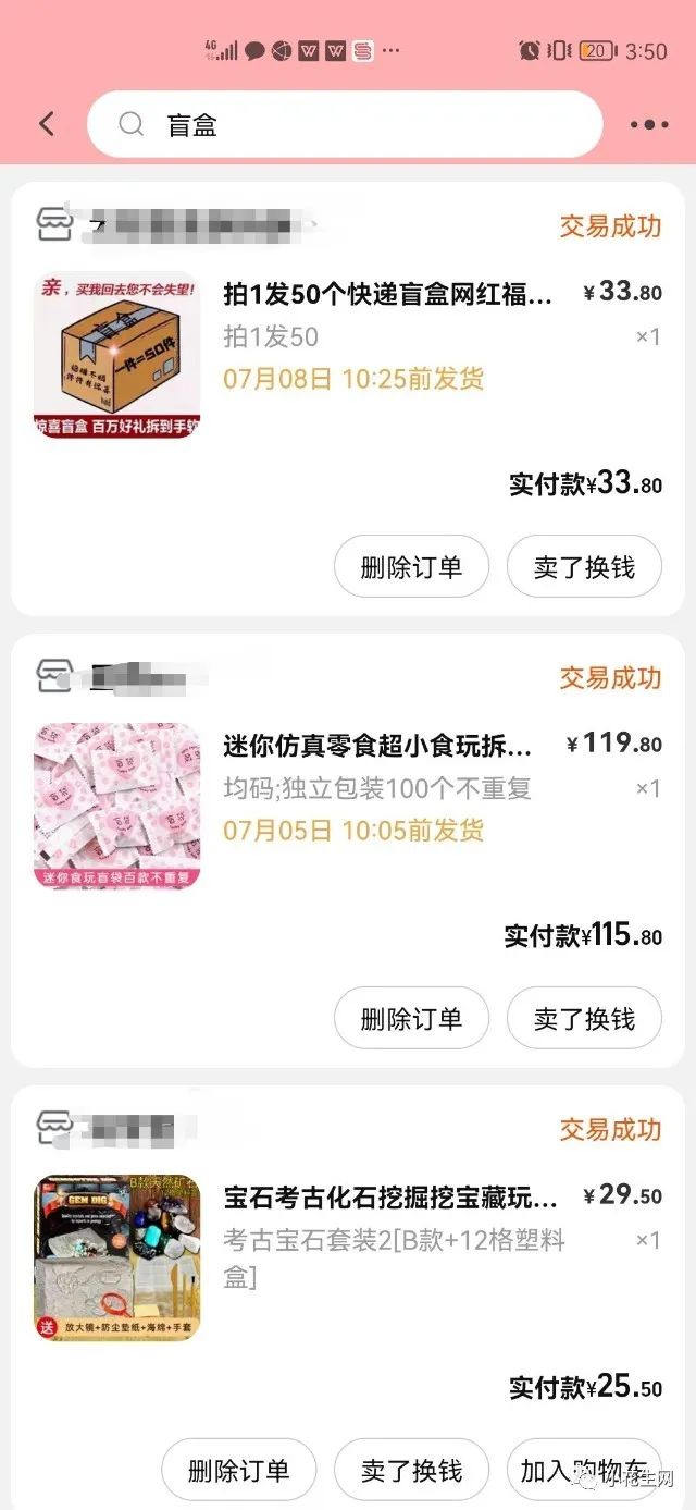 盲盒我买过很多,有38块钱一大箱快递的盲盒,给你拆快递,拆出来各种垃圾(笑),但是孩子确实很喜欢拆快递的感觉。