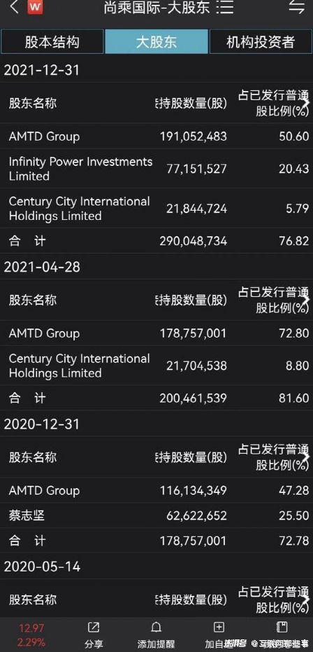 wind/图2022年7月15日,尚乘数科上市,如今,尚乘国际持有尚乘数科88.7%权益和99.4%的投票权,尚乘集团持有尚乘国际50.6%的权益,而蔡志坚全资持有尚乘集团32.5%的权益,并且,蔡志坚独资的Infinity Power Investments Limited还是尚乘国际的第二大股东,持股20.43%,也即蔡志坚实际享有的尚乘国际权益为(16.44%+20.43%=36.87%)