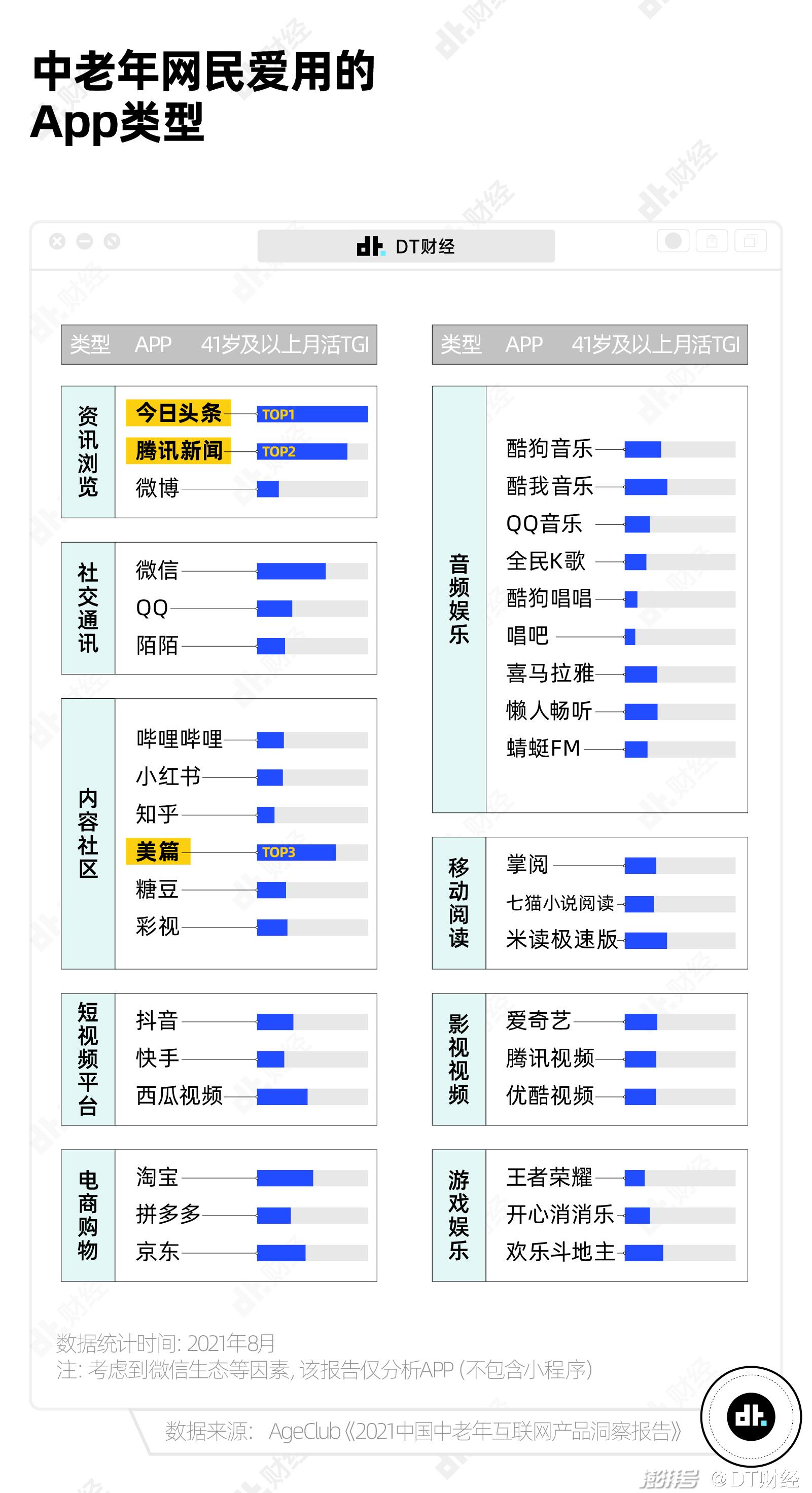 去年年底 AgeClub 发布了《2021中国中老年互联网产品洞察报告》,数据显示,定位于中老年用户的内容社区平台美篇,45 岁以上的用户数已经达到1.07亿,仅次于今日头条和微信。而在用户粘性上,美篇 App 也基本与头部 App持平。