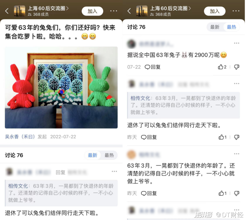 比如在“上海60后交流圈”里,一个很火的帖子是一位63年出生的美友,她自称“兔兔”(属兔),还想找其他“可爱的63年的兔兔”一起结伴旅游。